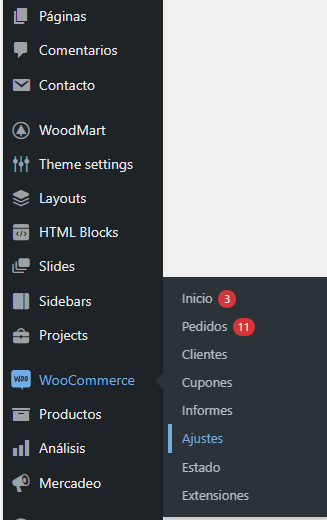 2. En el panel de WordPress, acceda a WooCommerce, después elija Ajustes.