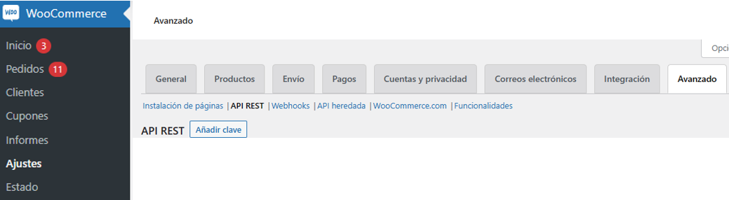 3. Dentro de Ajustes, selecciona la sección Avanzado y elegir la opción API REST.