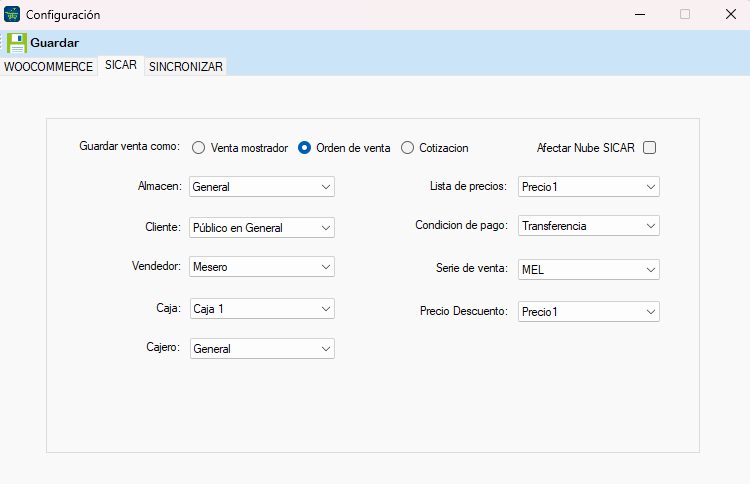 A continuación, en la sección de ERP (SICAR, MICROSIP, CONTPAQI COMERCIAL Y PREMIUM), seleccione el formato en el cual desea almacenar las ventas, especificando los siguientes detalles: Almacén, Cliente, Vendedor, Caja, Cajero, Sucursal, Lista de precios, Condición de pago, Serie de venta y si se utilizarán precios con impuestos.