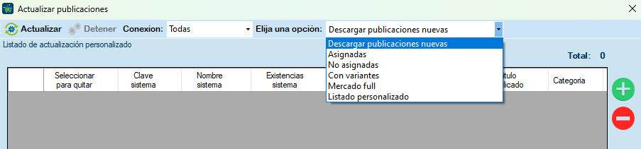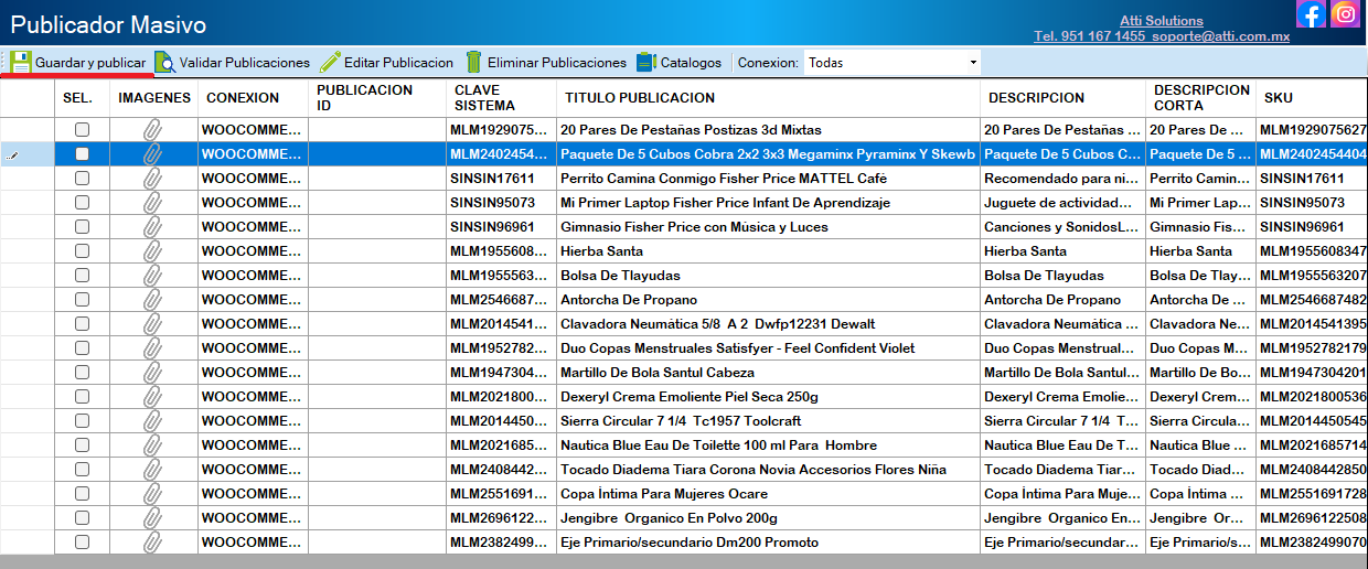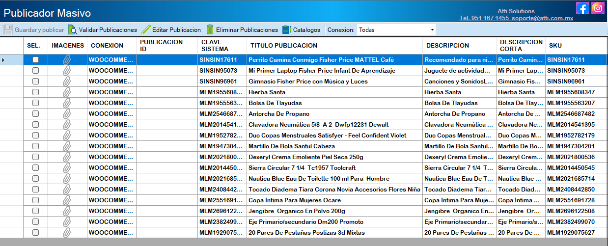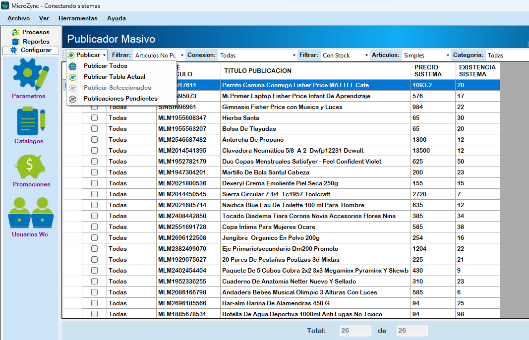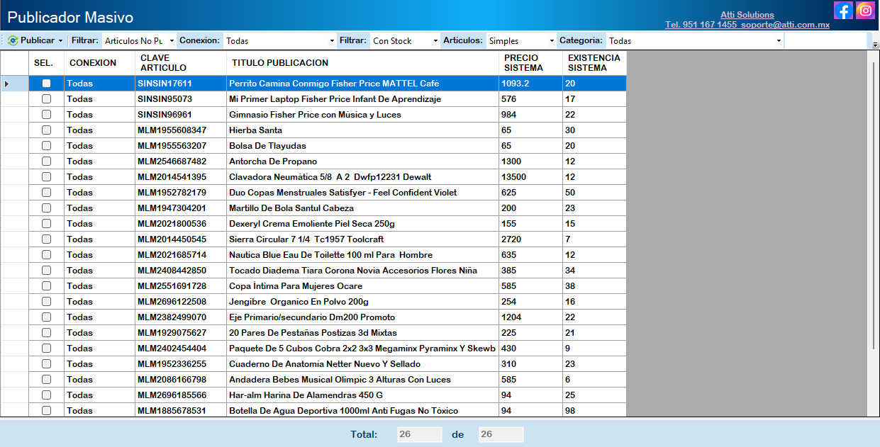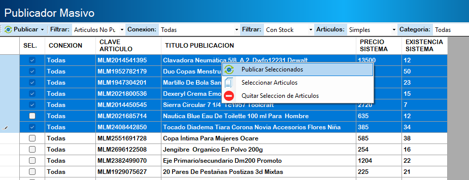 Enseguida nos mostrara la siguiente ventana del Publicador Masivo con el filtro de artículos no publicados, con stock y de todas las categorías.