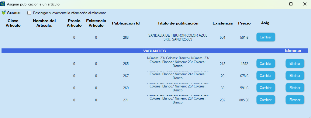 Asignar publicación a otro artículo: Permite cambiar la relación con el artículo local, por si se equivocó o simplemente desea cambiar el match. Esta opción permite relacionar artículos de manera manual entre el artículo de WooCommerce con el del sistema origen.