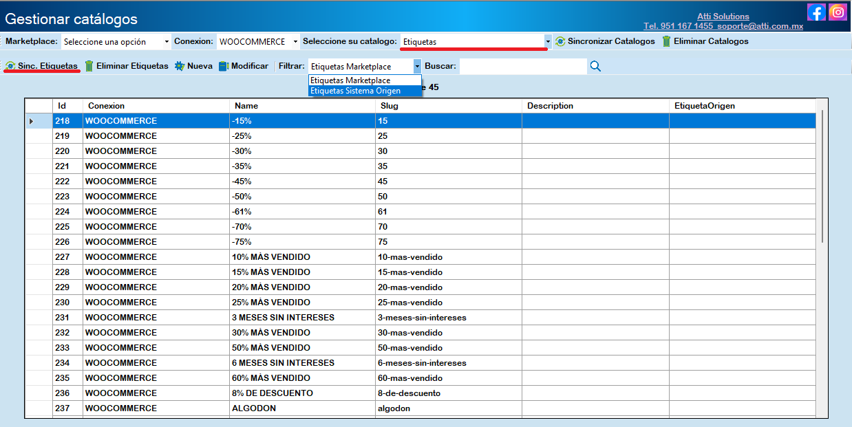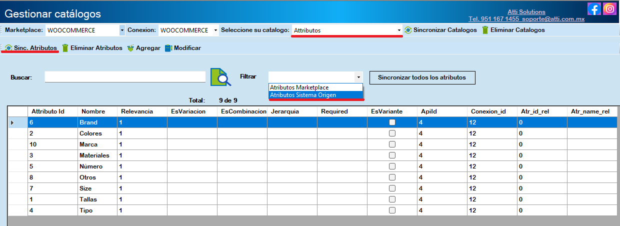 Filtrar muestra la opción para ver Atributos Marketplace de WooCommerce y Atributos sistema Origen.