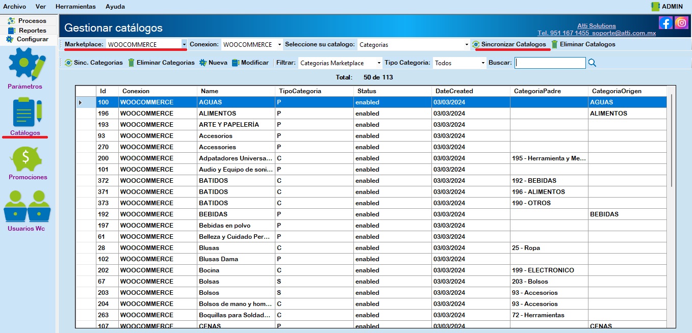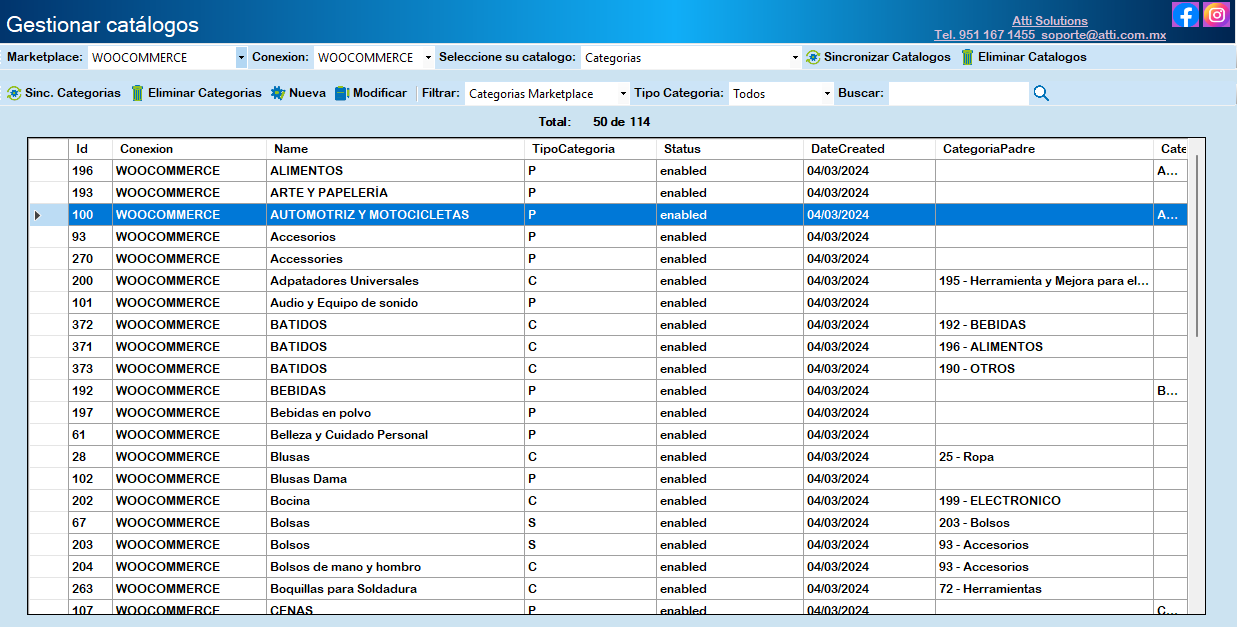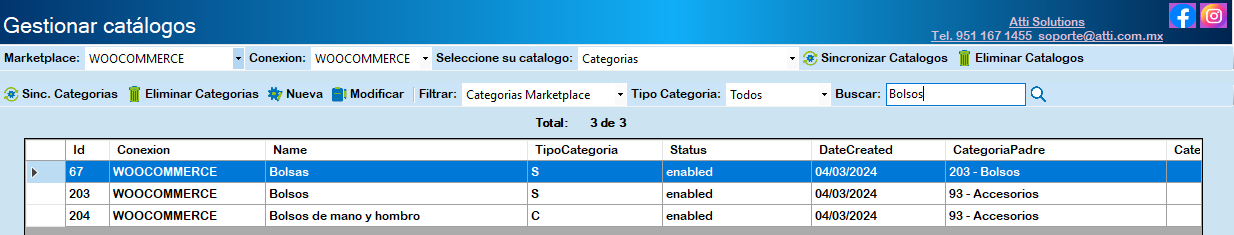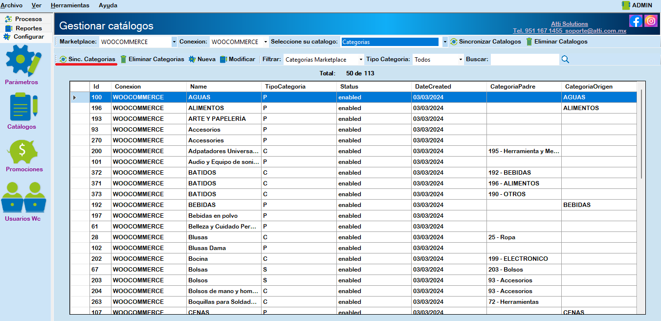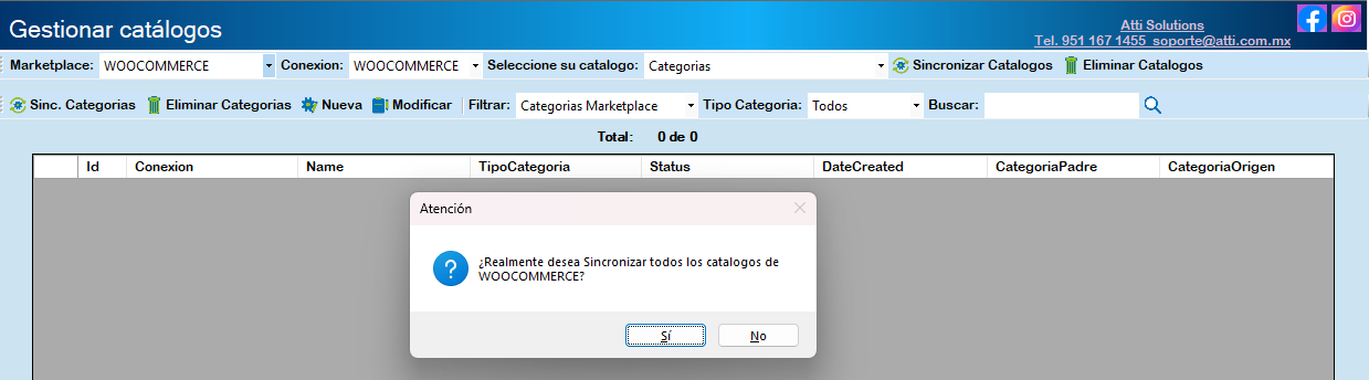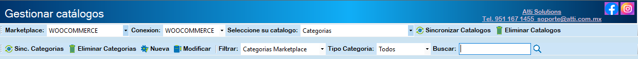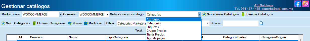 Para descargar el catálogo de categorías seleccione Categorías y haga clic en Sinc. Categorías.