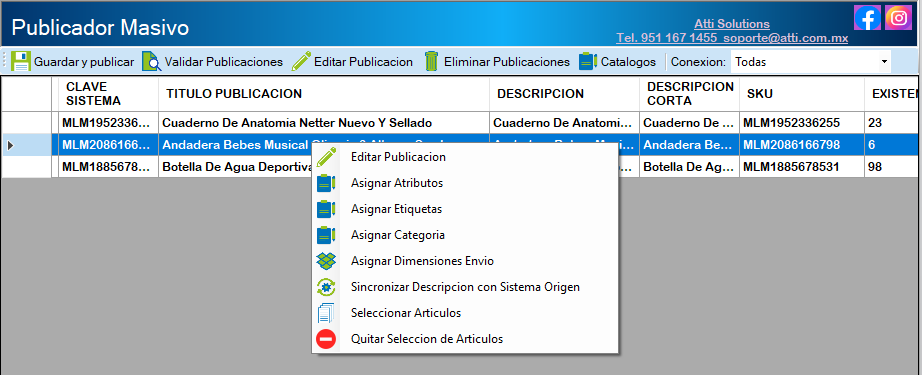 Al realizar clic derecho sobre el artículo en esta vista del publicador masivo muestra las siguientes opciones Editar Publicación, Asignar Atributos, Asignar Etiquetas, Asignar categoría, Asignar Dimensiones Envió, Sincronizar Descripción con sistema origen Seleccionara artículos y Quitar artículos.