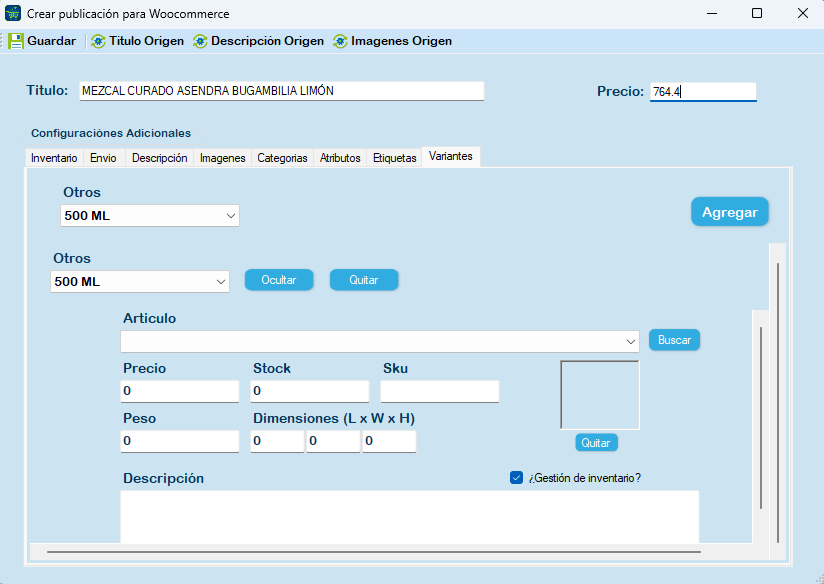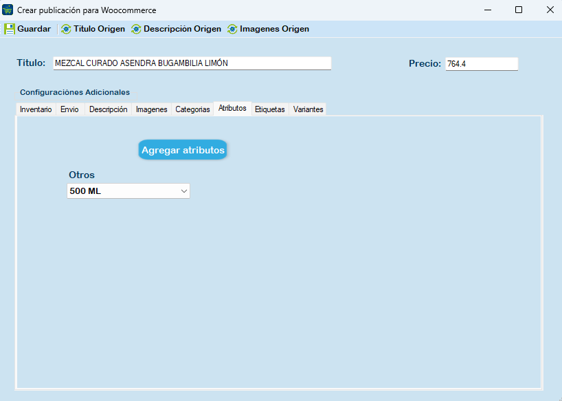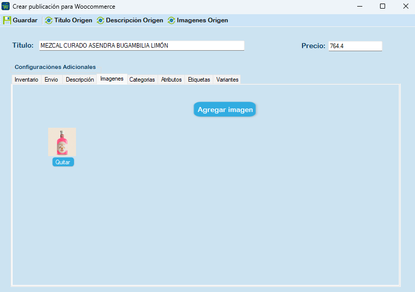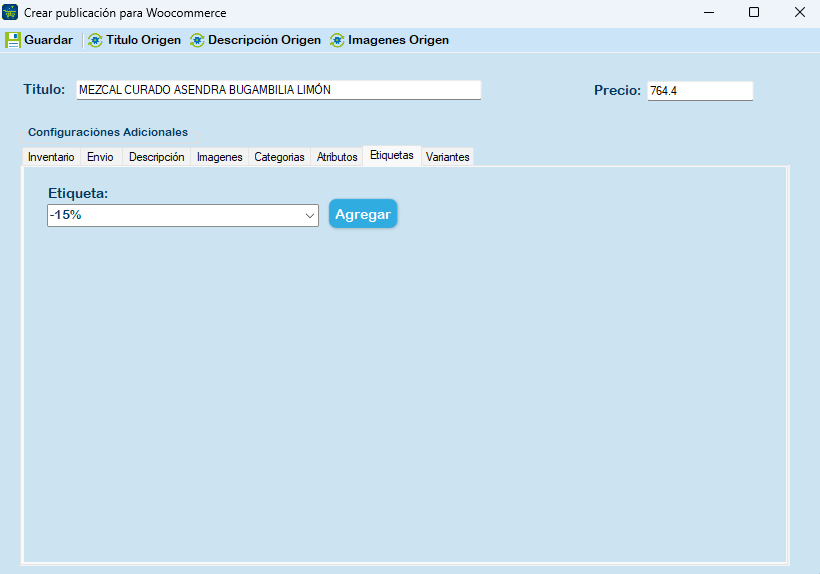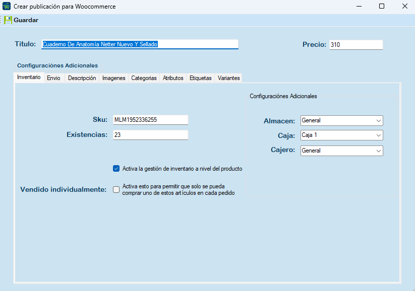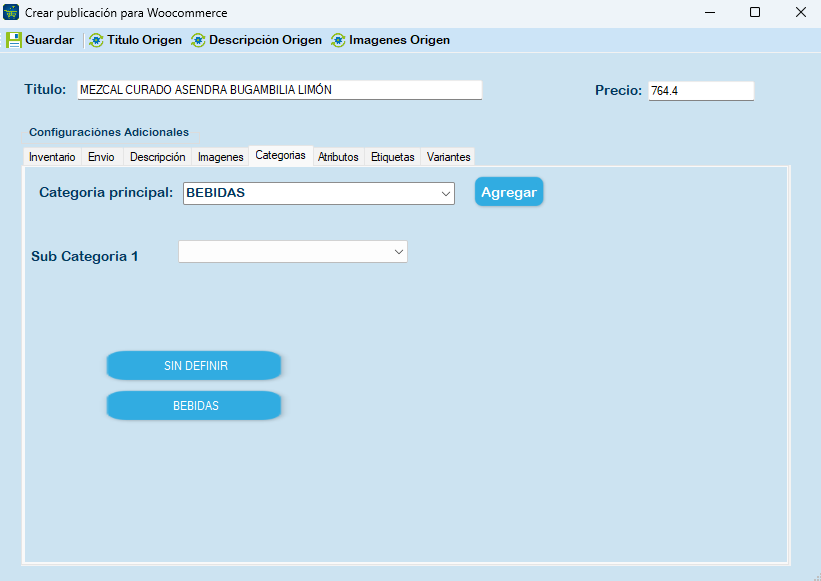 En seguida se le muestra la sección Inventario, Envío, Descripción, Imágenes, Categorías, Atributos, Etiquetas y Variantes.