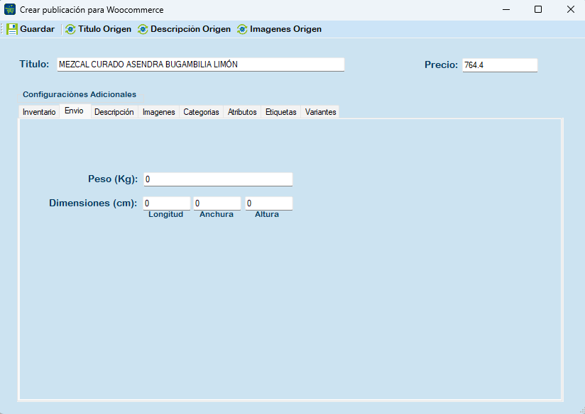 Envío: Permite configurar los datos de envió, como es el peso (kg) y dimensiones (cm), longitud, anchura y altura.