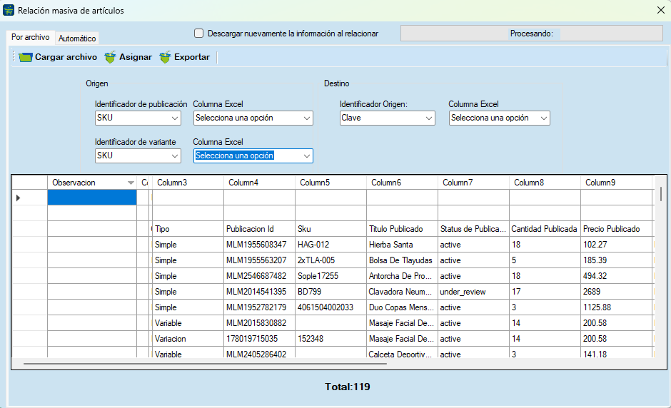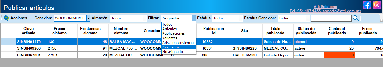 Asignados: Se muestran todos los artículos relacionados entre el sistema ERP y WooCommerce.