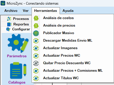 En la parte superior de Microzync, encontrará la opción de «Herramientas», donde verá diferentes opciones como «Precios Tierd WC», «Análisis de Costos», «Análisis de Precios», «Publicador Masivo», «Descargar Medidas Envío ML», «Actualizar Imágenes» y «Actualizar Precios + Comisiones ML».