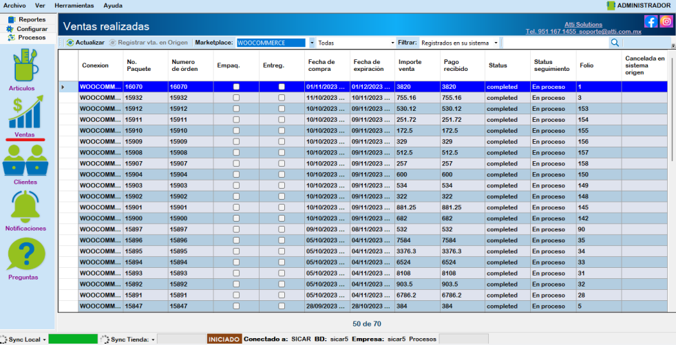 En la sección Procesos → Ventas, se pueden visualizar todas las ventas que se van descargando de su tienda, solamente las ventas completadas se registran en el Sistema Origen y se descuenta en el inventario.